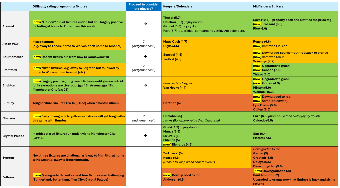 - But it remains the case that without knowing which "niche" element will perform, it's always good to place your bets on both as far as possible - i.e. good players from good fixtures, and only then do we take more uncertain risks. i.e. it still makes sense to first look at teams with good runs (Arsenal) and decent buys (Brighton attack, Crystal Palace, Liverpool punts, and non-Haaland Manchester City players), and only if we are saturated/the budget runs out do we start looking elsewhere.