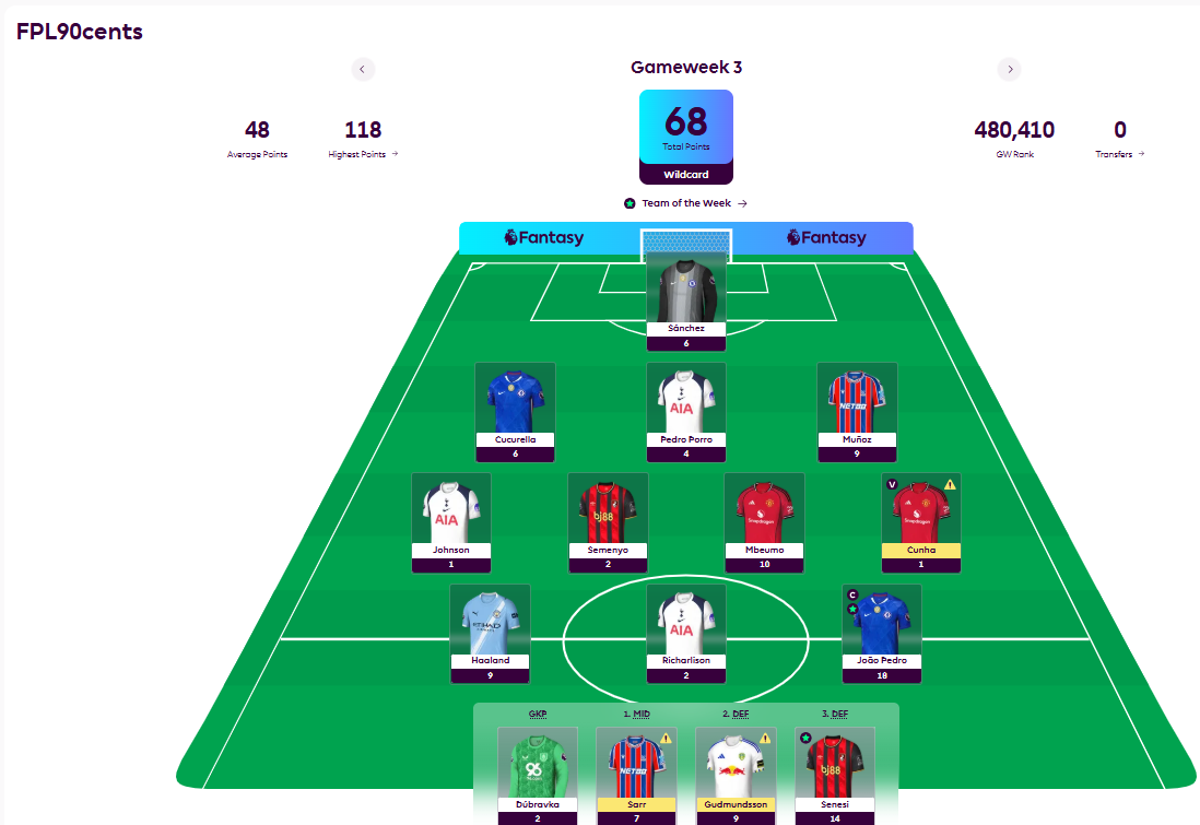 Most importantly our decision to go with a GW3 wildcard seems justified even though the transfer window had not closed - we dropped players such as Dorgu, Trafford (now even more unlikely to play to Manchester City), Palmer, Wirtz, and P.M. Sarr, in exchange for players of more proven quality at this point.