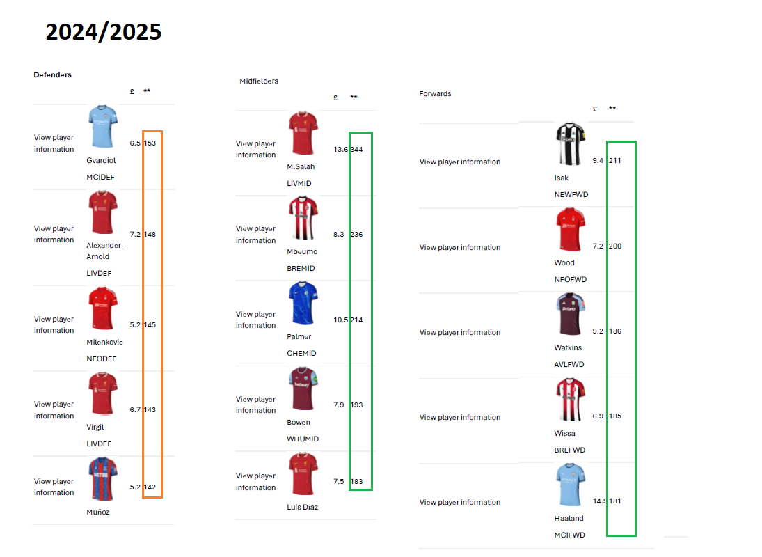 At the end of last season, all of the top five midfielders and top five forwards scored more points than the top five defenders: