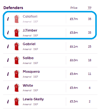 - If things do change drastically later, the "four point" cost of transferring Calafiori/Timber out if need be seems reasonable in exchange for the prospective reward: Calafiori/Timber (35 pts each) are now almost double the points of Saliba (17 pts) right now and nearly 1.5X the points of Gabriel (25 pts).