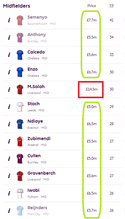 - Salah can also be worth it if there are no good alternatives anyway, which we think is why many are sticking to him - Saka and Palmer are not firing yet, and the rest of the top midfielders do seem like unfamiliar names. E.g. if other names are cheap/inconsistent, why save up just to have money in the bank? But we are confident that although there are no obvious alternatives, a squad can collectively do better from the money not spent on Salah.