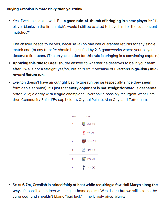 - We warned after Grealish's haul on GW3 that buying him was more risky than people realised - he is since on his third consecutive blank, mid-way of the six fixtures that we highlighted.