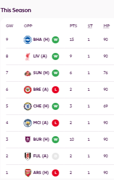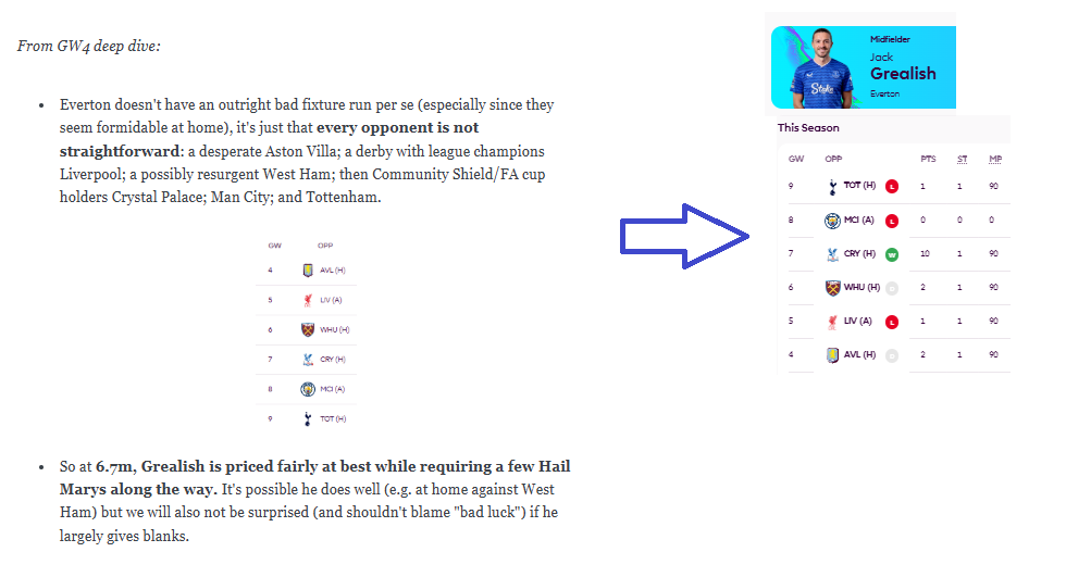 Another thesis that came true: We earlier warned against buying Grealish given the tough games at GW4-9, true enough, he blanked in every week except when he "scored" because a defender cleared off his back.